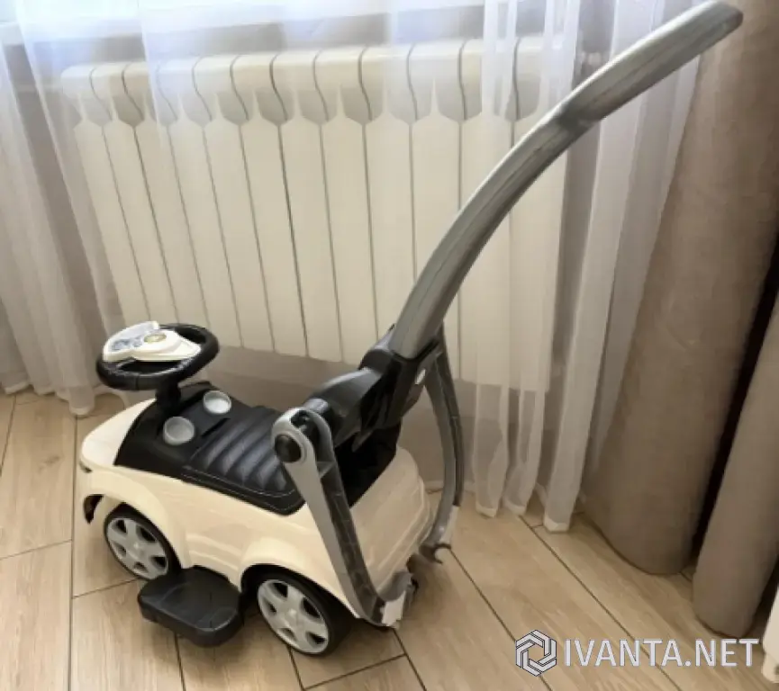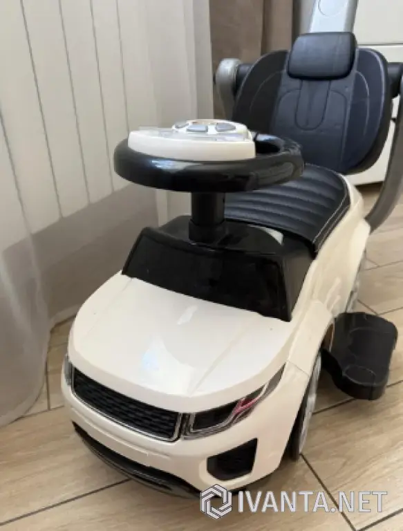 Продам машинку-каталку с родительской ручкой, кожаное сиденье, резиновые колеса, цвет белый. Пару раз выезжали на улицу и то возле подъезда, стоит без дела, ребенок ей не пользуется. У машинки поворотный руль со звуковыми эффектами. Предусмотрены съемные элементы: родительская ручка, бампер, подножка. Размеры: Ш-43, Д-61, ВР-86.