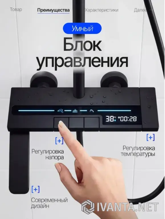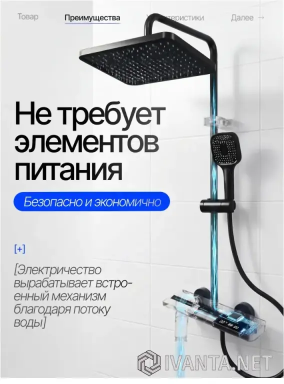 Панель с LED дисплеем выполнена из водонепроницаемого покрытия. Благодаря встроенному датчику на экране выводится температура воды в реальном времени и таймер принятия водных процедур. Для работы подсветки НЕ ТРЕБУЕТСЯ ПОДКЛЮЧЕНИЕ К СЕТИ. Благодаря потоку воды вырабатывается электроэнергия.