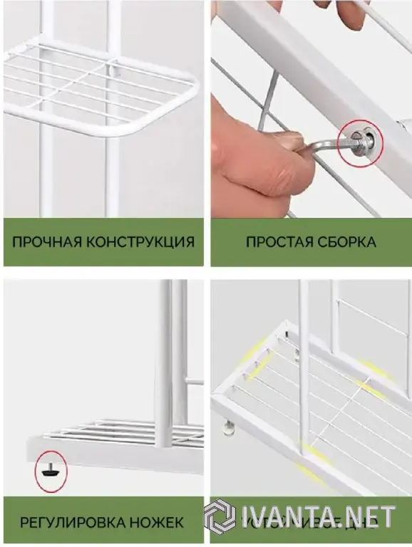 Подставка под цветы изготовлена из металла, максимальная нагрузка на полку — 4 кг. После установки каждая полка и прочная стойка образуют устойчивую конструкцию. Среди преимуществ: откидные полки, экономия места, лёгкая сборка, регулируемые по высоте ножки. Многоуровневая конструкция решает проблему недостатка свободного места в помещении. Все полочки имеют скруглённые края, боковые уровни можно сложить, за счёт чего высота цветка не ограничивается верхним ярусом. Эта стойка станет незаменимым элементом в вашем доме или на даче и гармонично дополнит интерьер и ландшафтный дизайн.