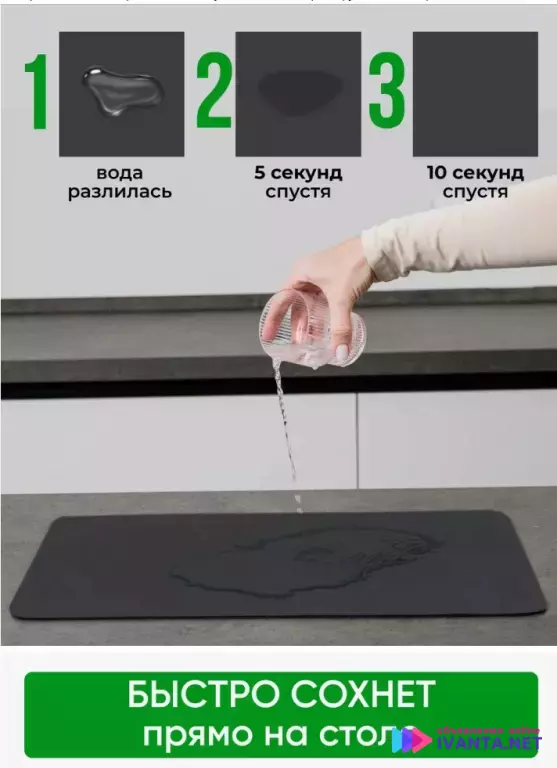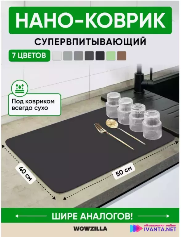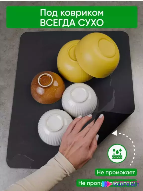 Супер впитывающий диатомитовый коврик для посуды – это то, чего не хватает Вашей кухне! С ним Вы забудете про мокрые полотенца и бесконечные лужи у кухонной мойки, обещаем! Используйте изделие для сушки тарелок, чашек и ложек. Он может заменить собой настольную сушилку, если у Вас нет места или не хочется иметь лишних предметов на рабочей поверхности. Оно отлично подойдёт на роль сушки для столовых приборов, стаканов, бокалов. Положите изделие на стол и попробуйте сушить на нем только что помытые овощи, фрукты, ягоды и зелень – это так удобно! Размер 50х40см универсален - площади будет достаточно, чтобы разложить целый комплект столовой посуды, кастрюли и сковороды. А если хотите уложить коврик в шкаф или ящик, то просто подрежьте до нужного размера. Края обрабатывать не потребуется. Используйте его в ванной комнате, чтобы предметы гигиены не оставляли мокрых следов. Положите также под миску для собак или под лоток для кошек. В чем секрет коврика от Wowzilla? Все просто – дело в особой технологии с суперпоглощающим эффектом, благодаря которому материал может впитать в себя влаги больше собственного веса. Влаговпитывающий коврик буквально всасывает в себя влагу, при этом его основание остается сухим – благодаря специальному защитному покрытию. Благодаря прорезиненному покрытию нет необходимости его вывешивать, просто оставьте на столе. Чтобы высохнуть, ему потребуется совсем немного времени - еще одна суперспособность изделия.