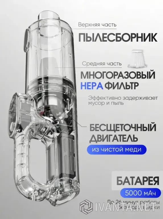 Портативный автопылесос оборудован бесщёточным двигателем и усиленным аккумулятором, который обеспечивает до 45 минут непрерывной работы. Зарядка — через USB, можно подключить к прикуривателю в машине. Он подходит для всех типов уборки: пыли, мусора, песка, шерсти животных. Отличный выбор для дома - мощный пылесос с контейнером.