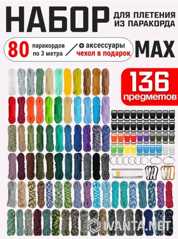 Паракорд - это надежный и универсальный материал, который применяется в самых разнообразных областях жизни. Декоративные изделия из паракорда также органично вошли в нашу жизнь. В наборе вы найдете 80 мотков по 3 метра (цвета могут немного отличаться), аксессуары для плетения, украшения, застежки, фастексы. Толщина паракорда 4 мм. В комплекте мешок для хранения и переноски.