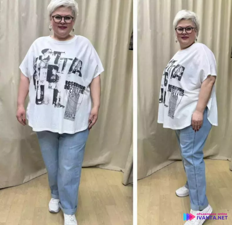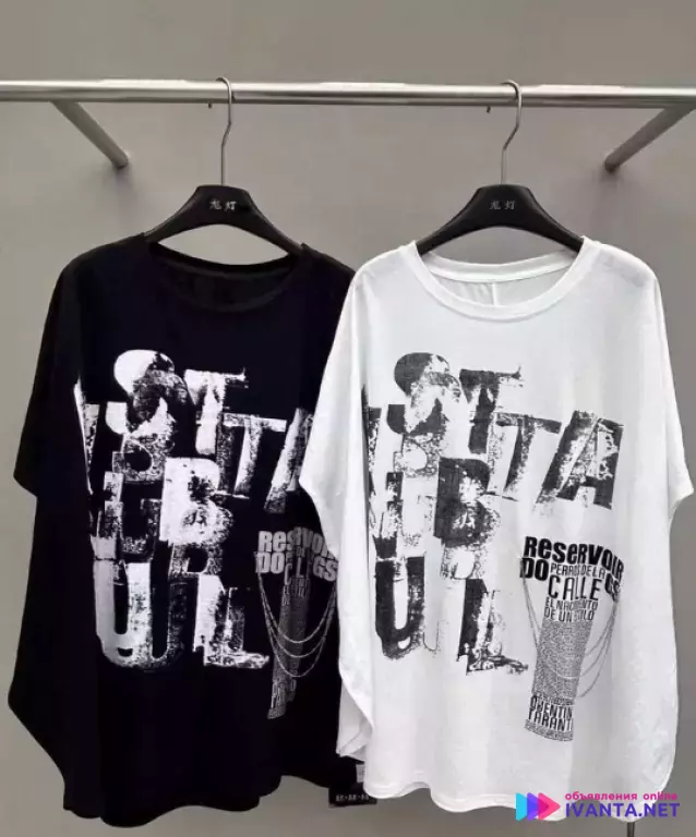Футболка женская Оверсайс 48-62 есть в белом и черном цвете, Обхват груби можно 130-140 по бедрам 150-160 точно подойдет .