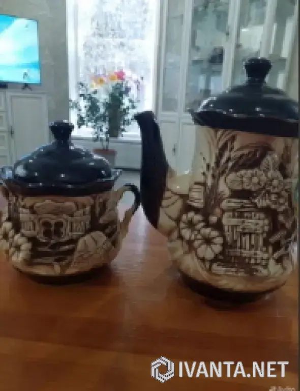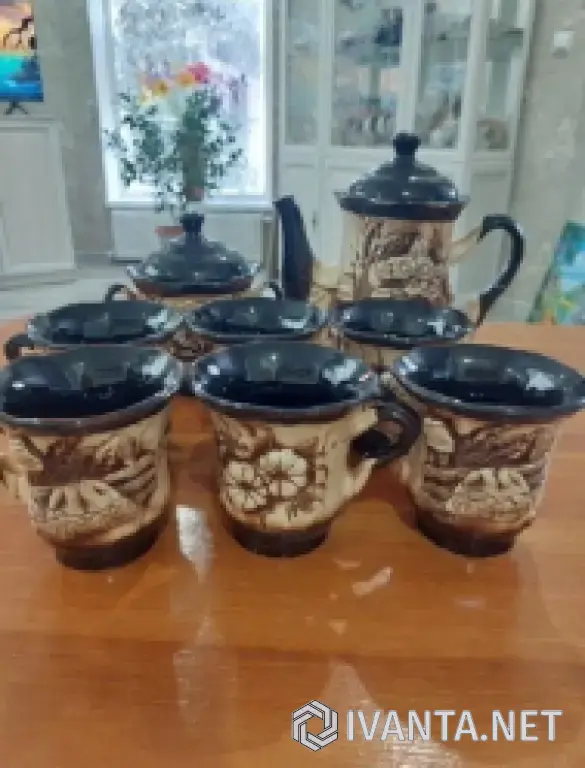 Состоит из большого чайника, сахарницы и 6 чашек.