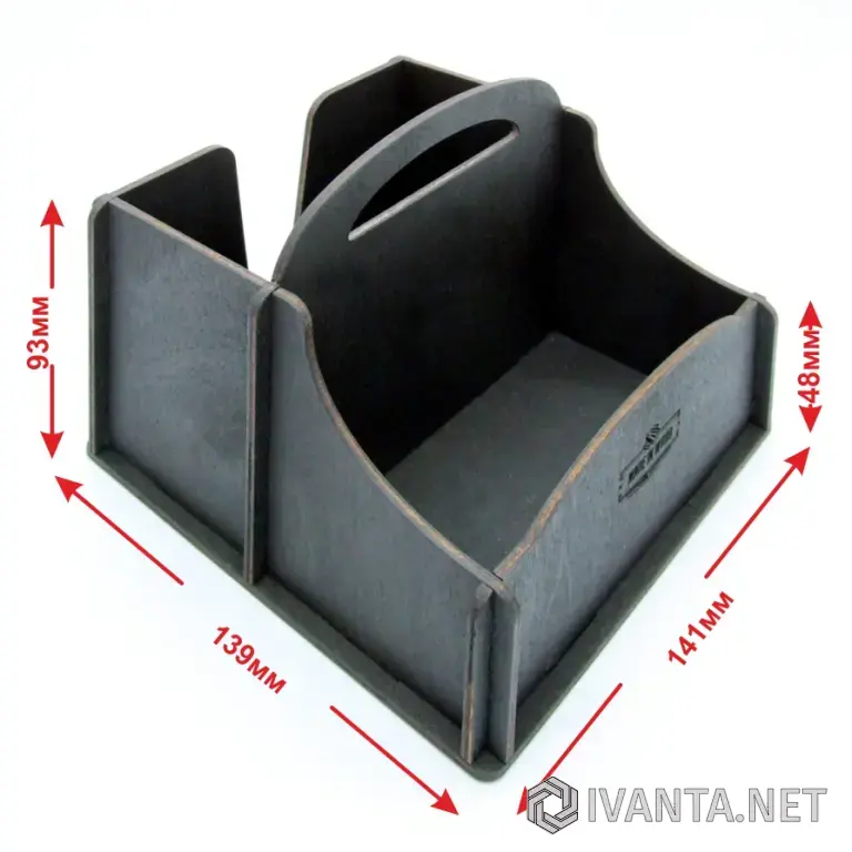 Размеры салфетницы 141х139х93мм и рассчитана она на стандартный размер салфеток.