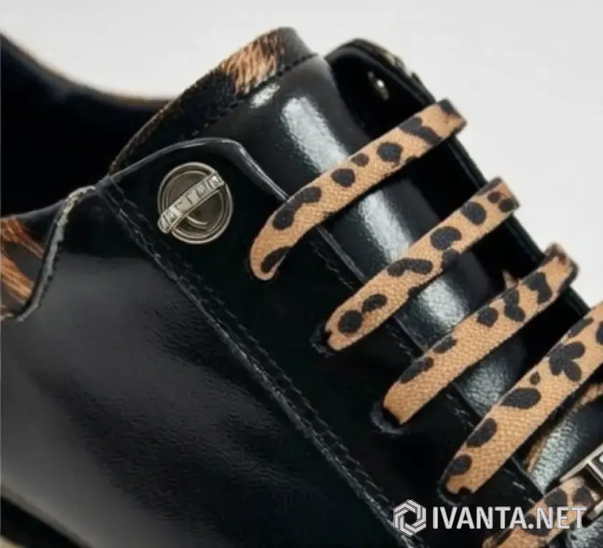 Шнурки: леопардовые, плотные, с металлическими люверсами и фурнитурой (серебристая пряжка/логотип на шнуровке)
