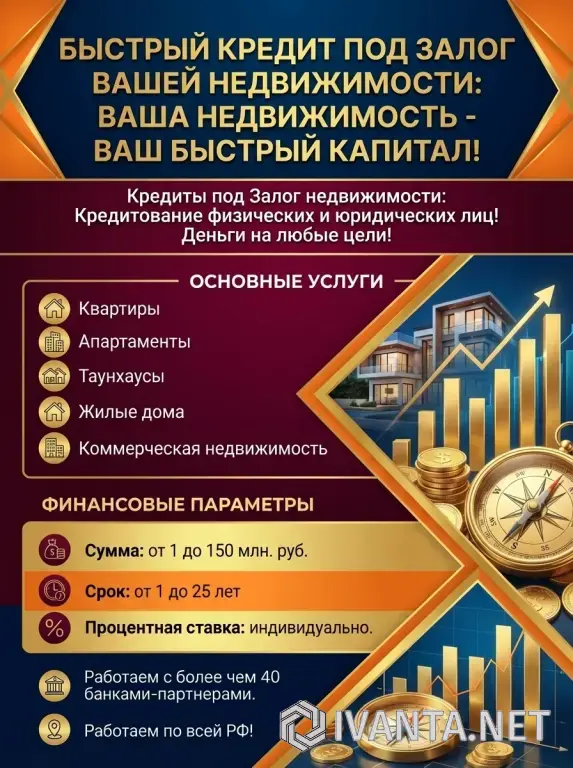 - Сумма от 1 млн. до 150 млн. рублей ( кредитование под залог недвижимости для физ. и Юр. лиц). Срок кредита до 25 лет.