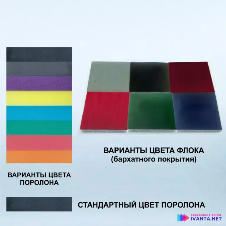 * При объеме заказа от 7000р возможно изготовление ложементов из флокированного поролона других цветов (варианты цветов флокированного покрытия и цветов самого поролона показаны на одной из фото в описании).