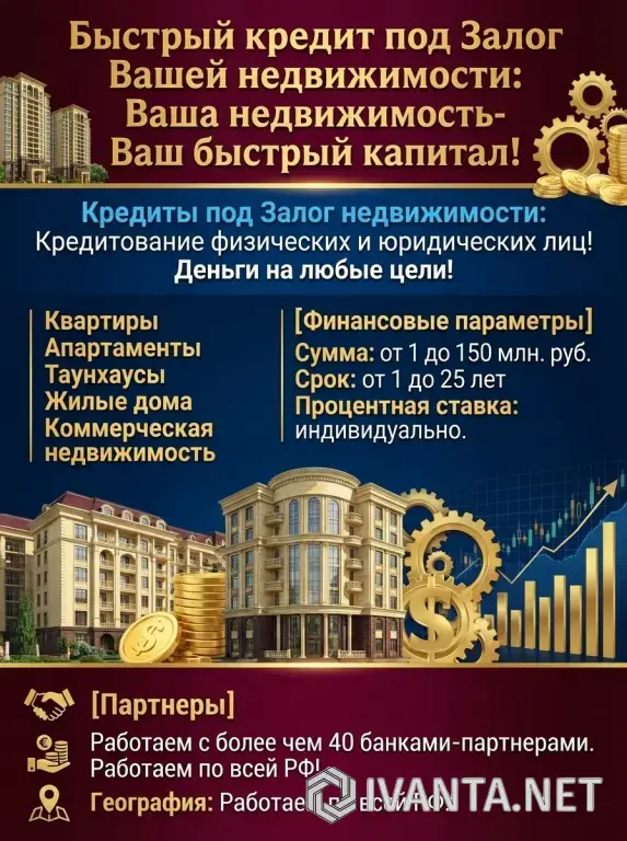 - Сумма от 1 млн. до 150 млн. рублей ( кредитование под залог недвижимости для физ. и Юр. лиц). Срок кредита до 25 лет.