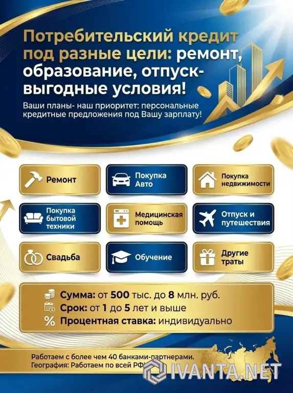 Поможем получить беззалоговый потребительский кредит на льготных условиях от 1 млн. до 5 млн. рублей - Для физических лиц, До 60 млн. рублей - для ИП и ООО.