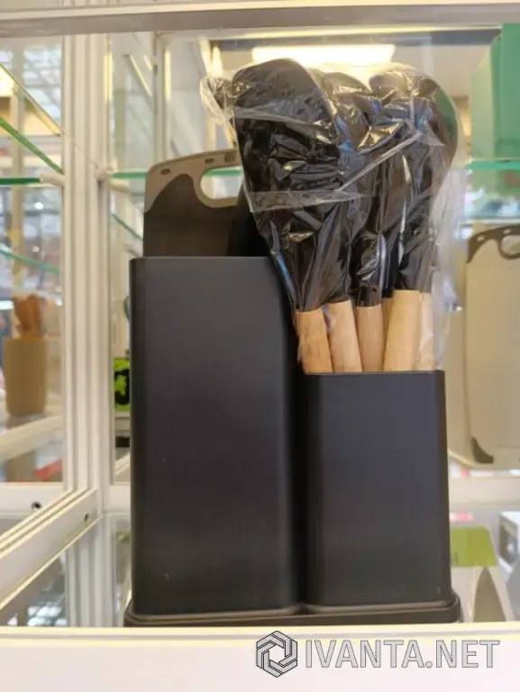 лопатка, лопатка с прорезями, ложка, ложка с прорезями, половник, шумовка, ложка для спагетти, щипцы, венчик, кисточка, кухонные ножницы, нож поварской, нож для хлеба, универсальный нож, нож для овощей, мусат (точилка), подставка для ножей, подставка для кухонных приборов.