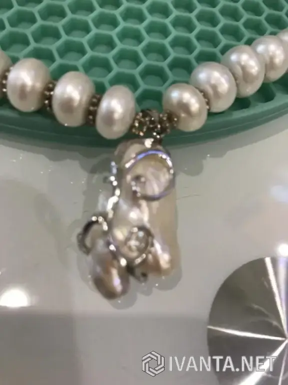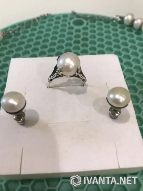 Комплект из Натурального жемчуга в серебре (Доминикана): колье, серьги-пуссеты и кольцо 18 р-р.