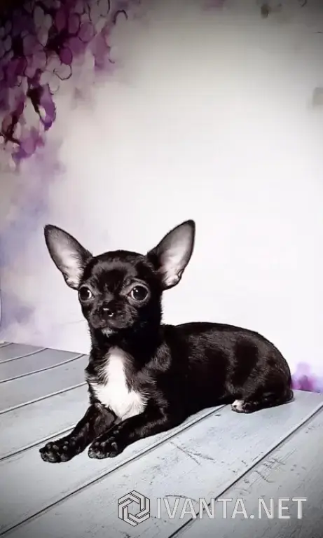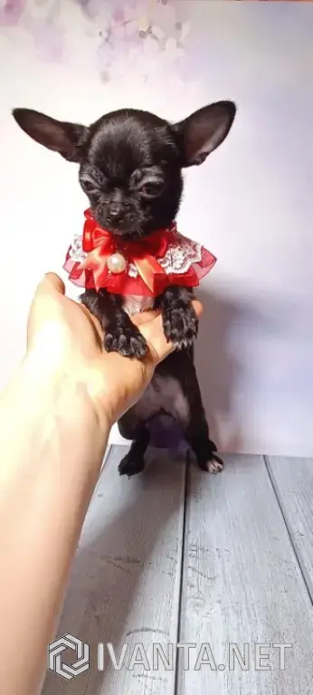 Шикарная изящная миниатюрная черная жемчужинка, девочка чихуахуа. Недостатков нет, зубы ровные, ножки крепкие, спинка ровная и хвостик серпиком, крупные выразительные глазки, она достойный потомок своих предков чемпионов разных стран. Характер тоже чудесный. Общительный и коммуникабельный. Возраст 4 мес. Вес 1100гр. Привита 3 раза.
