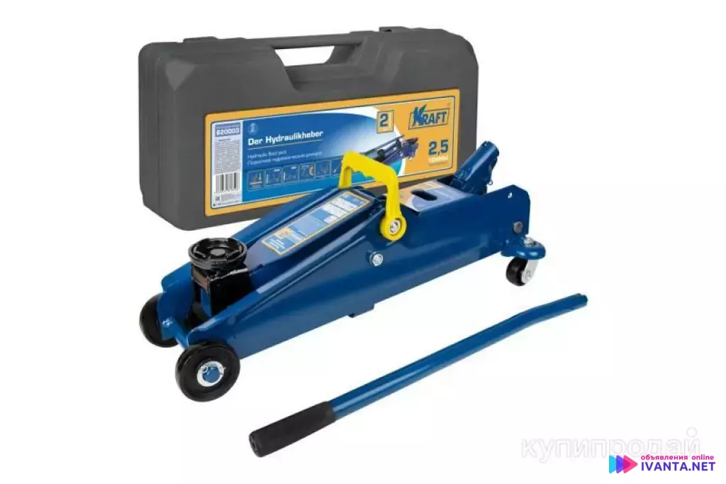 Подкатной гидравлический домкрат KRAFT 2.5 т, кейс KT 820003 предназначен для плавного поднятия автотранспорта на высоту до 385 мм.