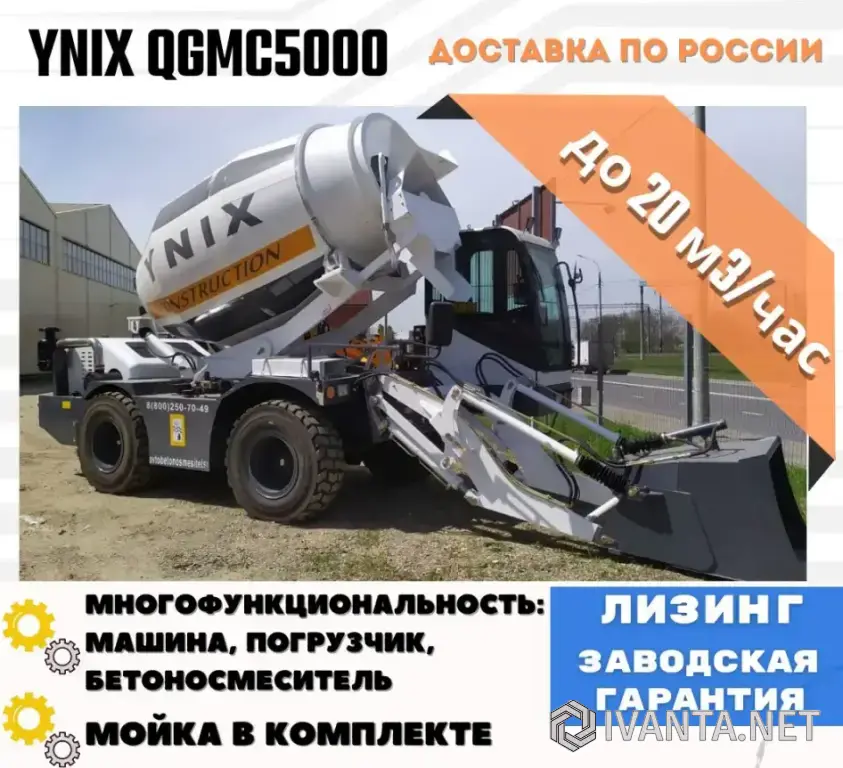 Бетоносмесители с самозагрузкой модели YNIX QGMC5000 с производительностью 20 м³ в час представляют собой современное оборудование для строительства. Эта техника оснащена барабаном объемом 6,8 м³ и позволяет загружать до 5 м³ за один цикл, обеспечивая соотношение загрузки в 80%. Барабан может вращаться горизонтально на 270° с высотой разгрузки 1,8 м. При максимальной производительности возможно выполнение до 4 циклов в час.