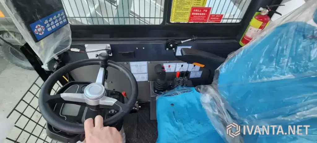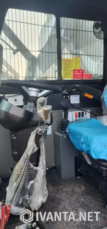 Кабина водителя отличается комфортом и удобством, имея эргономичное кресло для оператора. Гидравлическая система работает на основе двух шестеренчатых насосов, обеспечивая надежное управление через четырехканальный джойстик. Ковш с гидравлическим управлением имеет объем 650 литров.